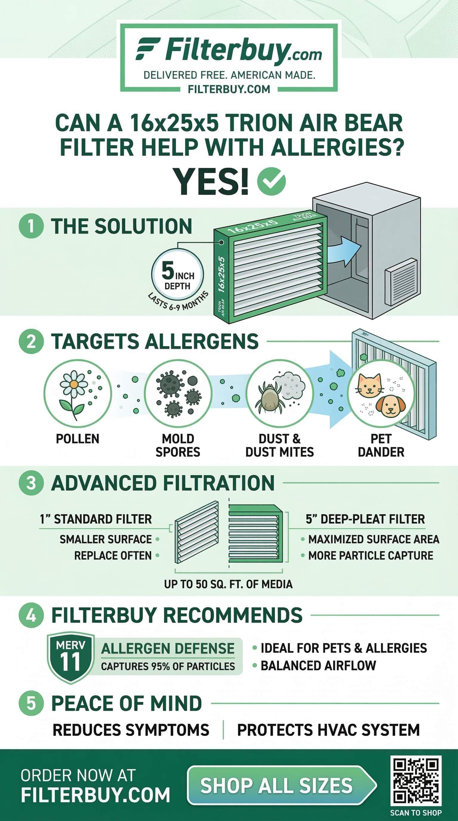 • Yes, it can help. The 16x25x5 Trion Air Bear uses a deep-media design that captures pollen, mold spores, and pet dander far more effectively than standard 1-inch filters.